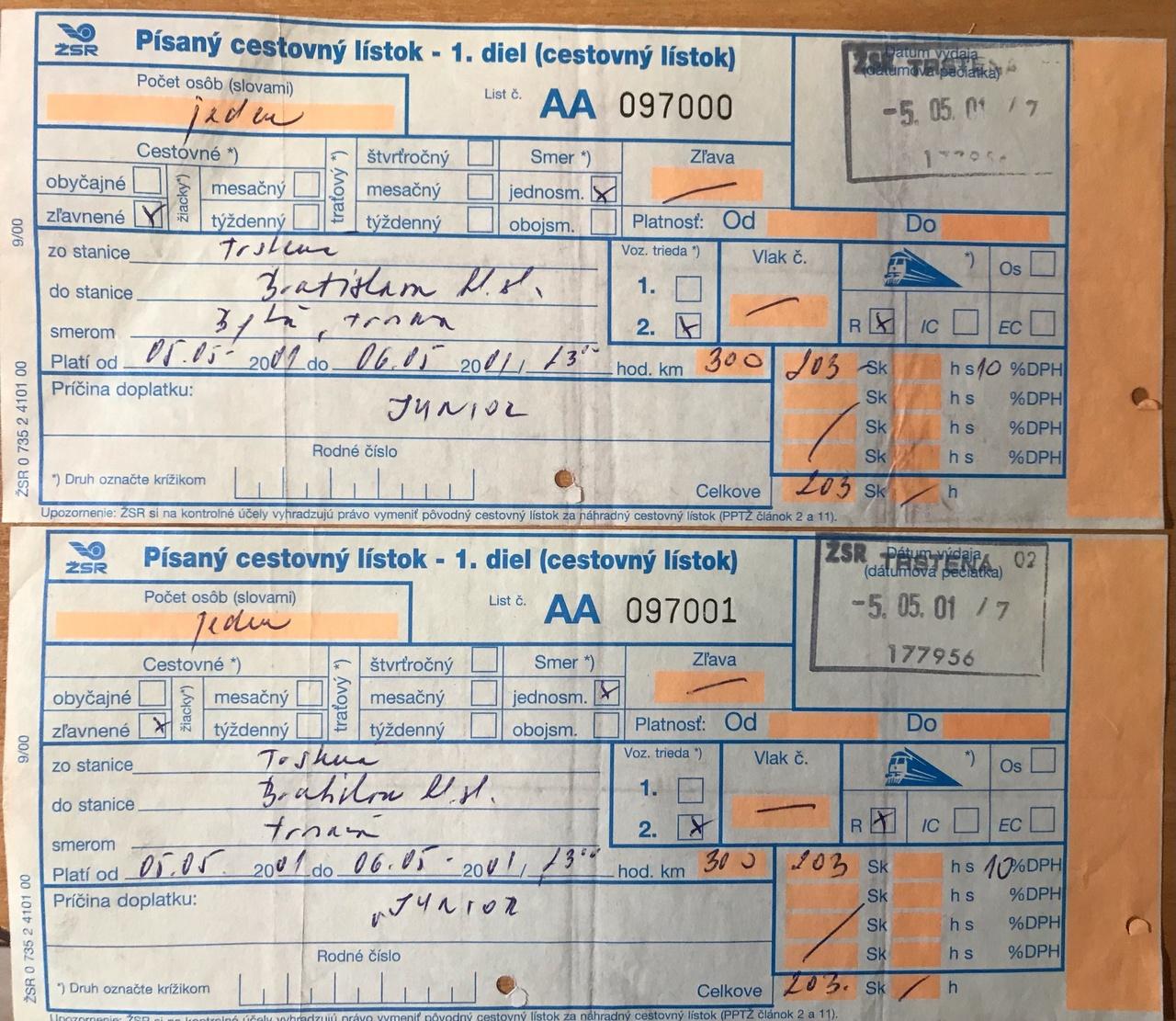 Конкретно эти билеты на их поездку из их родного города Трстены в Братиславу. Потом из Братиславы они летели самолетом до Праги, а уже оттуда в Питер. Гостили у нас недели две и были очень сильно впечатлены поездкой.