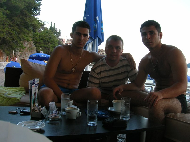 За эти несколько дней я изрядно загорел на палящем солнце. Купил красивую футболку с символикой Черногории и фотографировался в ней вечером со всеми тремя братьями.