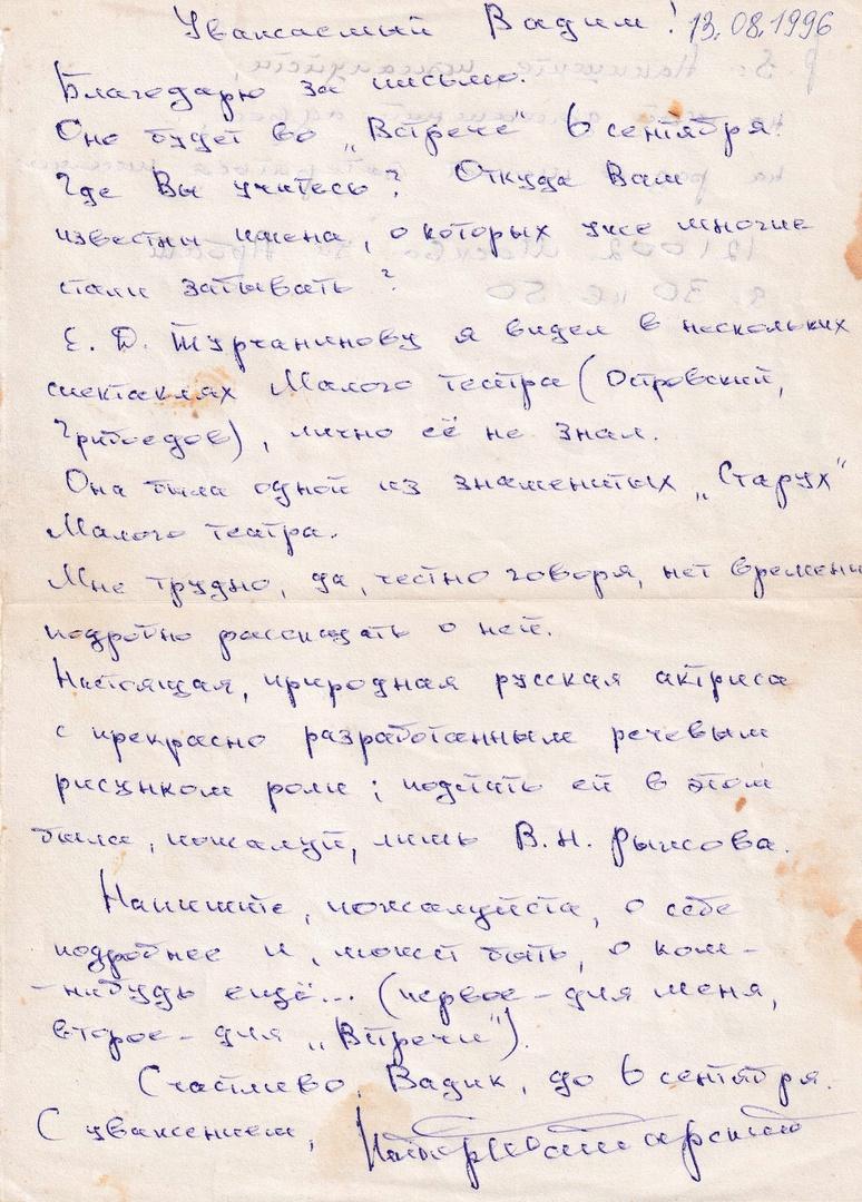 Потом я написал еще письмо о дружбе Е. Д. Турчаниновой с Л. А. Руслановой, и это письмо тоже было зачитано во «Встрече», и была в эфире песня в исполнении Л. А. Руслановой. Было много и других мыслей и историй, связанных с песнями, но я их все откладывал. Вот теперь, к сожалению, больше уже не удастся написать ему письмо, все надо делать вовремя. Виктор Татарский и его передача «Встреча с песней» была крупным явлением в нашей культуре, которое навсегда войдет в историю. В память о нем прикладываю здесь копию его письма ко мне в 1996 г.