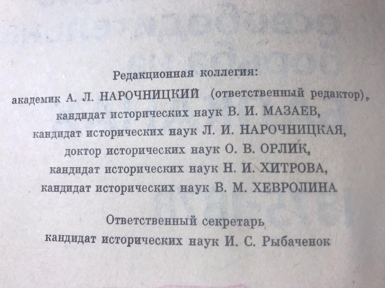 А вот и ещё одна книга с автографом академика Нарочницкого. Подписана его собственной рукой, ниже расписалась одна из соавторов по редколлегии. Адресован автограф некоему Александру Александровичу Преображенскому, в год выхода — 1984.
