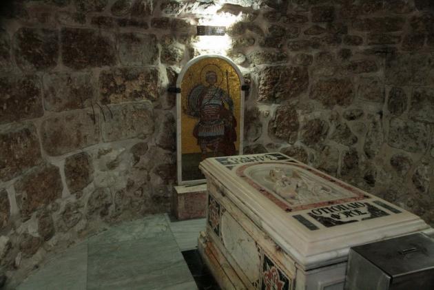 Самих мощей не осталось, они маленькими частичками разошлись по всему миру, а здесь, кажется, есть только маленькая частичка. Гробница находится в крипте, под алтарем и солеей, поэтому, когда читаешь, что в древности храмы устраивали на гробницах святых, мучеников, то здесь как раз тот самый случай. Храм этот сложен из серого камня. Рядом с гробницей мученика имеется его икона и изображения его родителей – Геронтия и Полихронии, которые почитаются как местночтимые святые.