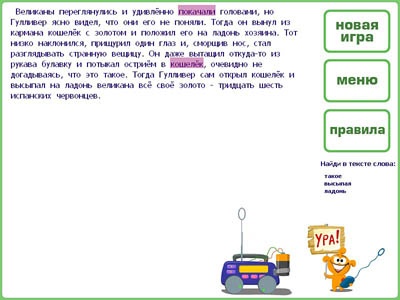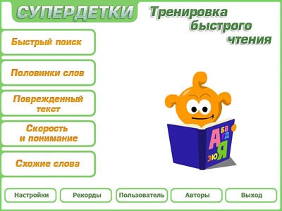 Приготовьтесь к выполнению нескольких развивающих заданий, например, “Скорость и понимание”, “Быстрый поиск”, “Поврежденный текст”, “Половинки слов”, “Схожие слова”. Уровень сложности этих заданий можно выбирать по своему усмотрению, начиная с самого простого.