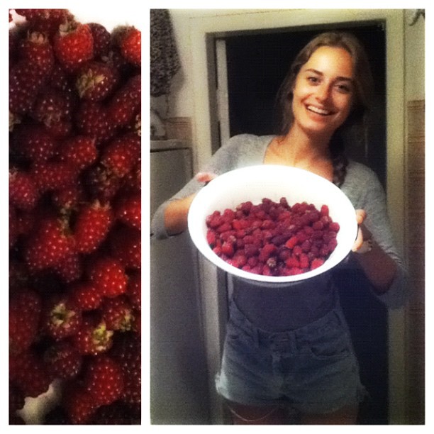 На завтрак я, например, могу скушать четыре банана и кучу там ягод всяких замороженных. Это я сейчас ем. Но я не чувствую от такого завтрака, что наелась. Так что, после этого, я могу подождать немножко, может быть, час, и потом съедаю огромный салат. Я туда всякие овощи бросаю. Для салатов у меня есть какой-то сырой дрессинг, очень вкусный! Честно, я так влюбилась в салаты, серьезно, ребята! Мне нравится, что утром я люблю хорошо кушать.
