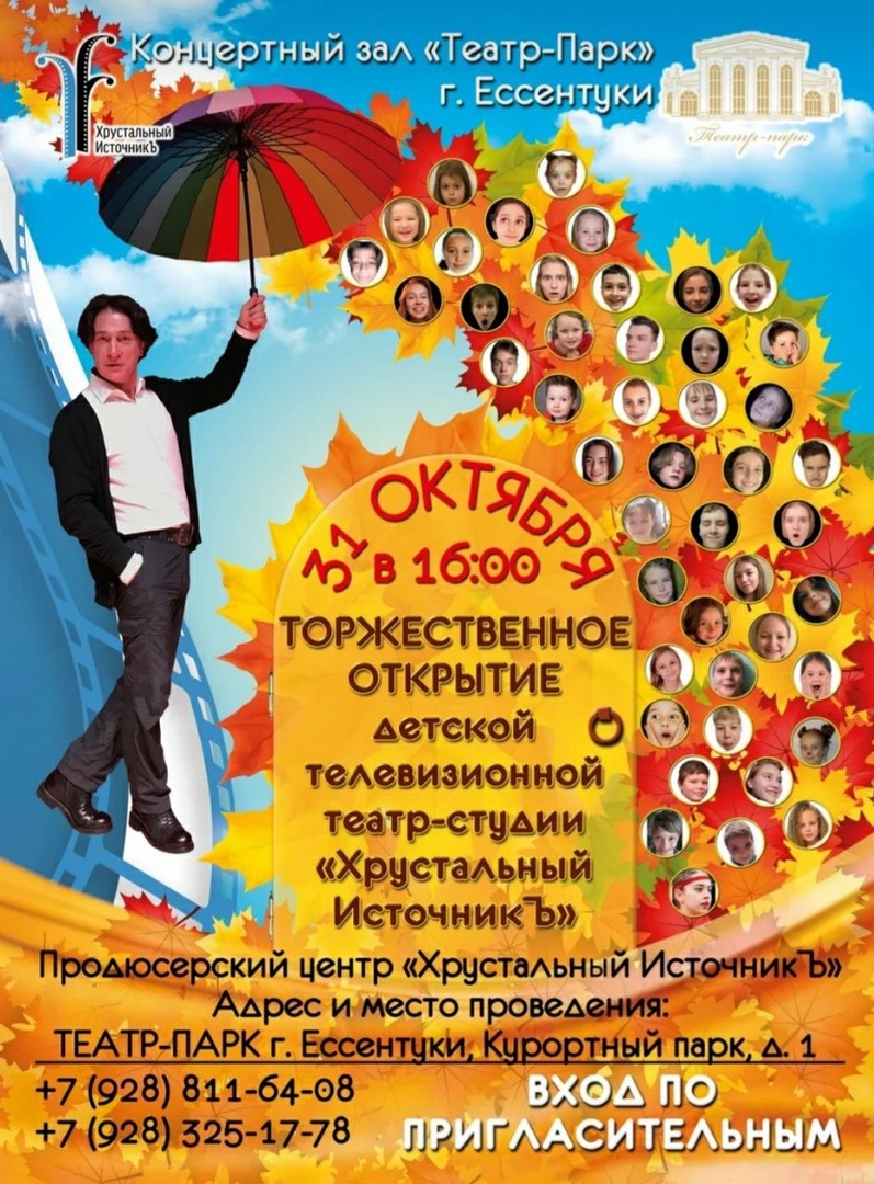 31 октября 2021 года, в 16 часов, в Театр-Парке города-курорта Ессентуки детский телевизионный театр-студия «Хрустальный ИсточникЪ» с удовольствием представит вниманию широкой публики премьерный шоу-концерт. Юные дарования покажут, чему научились за два месяца обучения. Это их дебютный выход на сцену.