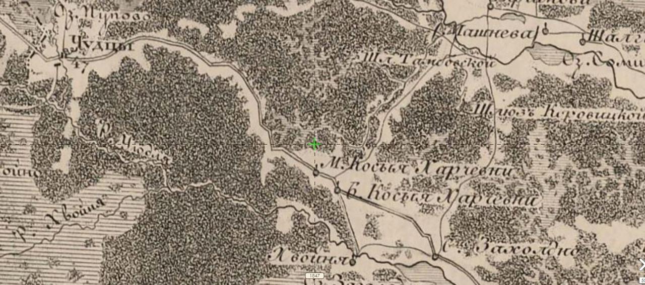 На карте Новгородской губернии 1847 года хорошо прописаны Чудцы, Косые Харчевни малые (Заручье) и Косые Харчевни большие. Заголодно почему-то написано как «Захолдно», хотя озеро называется именно Заголодно.